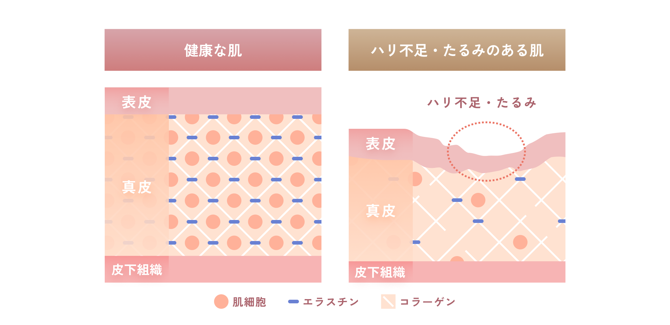 肌のハリ不足やたるみは、加齢や紫外線によるコラーゲンやエラスチンの減少が主な要因です。